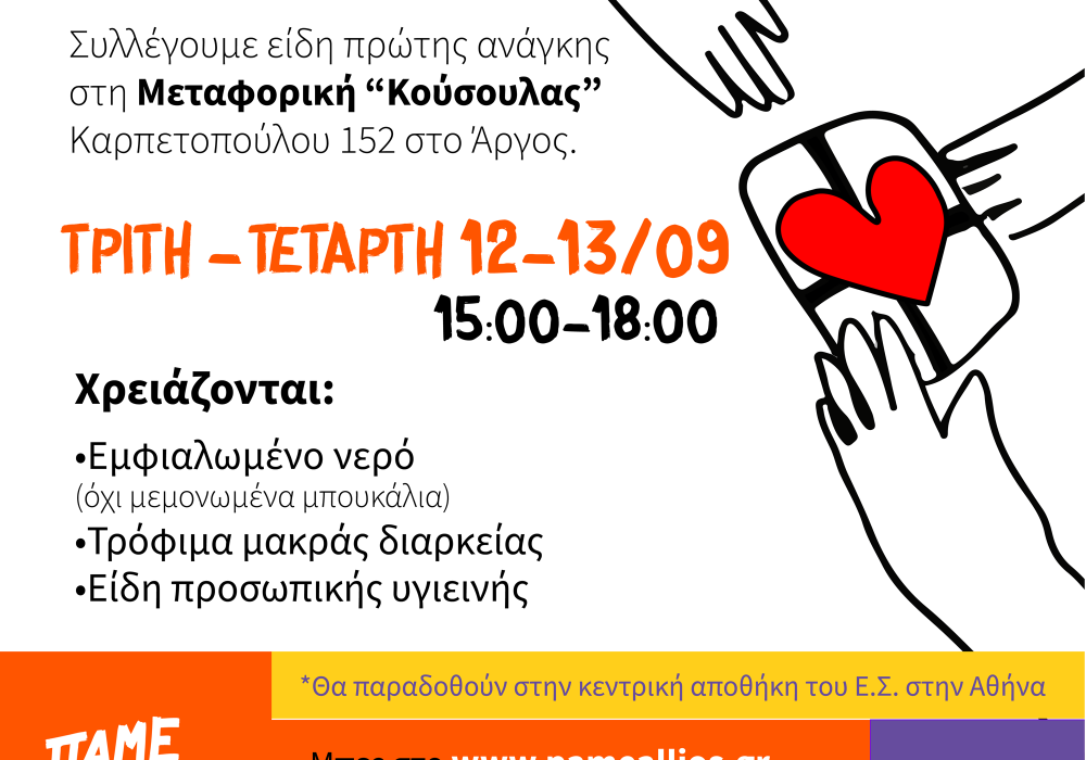 Συγκεντρώνουμε είδη πρώτης ανάγκης για τους πλημμυροπαθείς. Τρίτη και Τετάρτη 12-13/09 από τις 3 το μεσημέρι έως τις 6 απόγευμα στη μεταφορική…